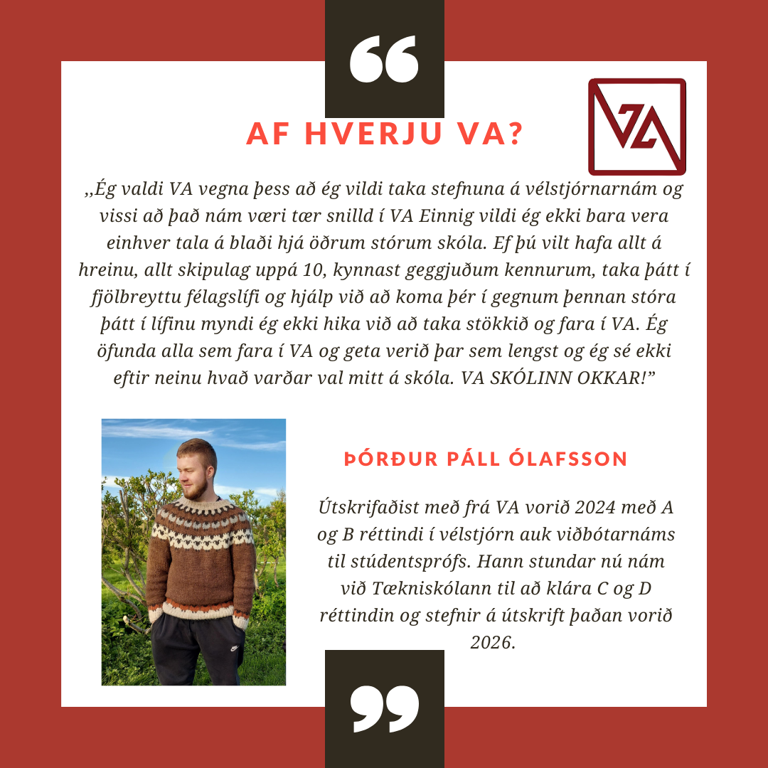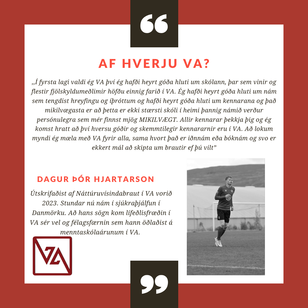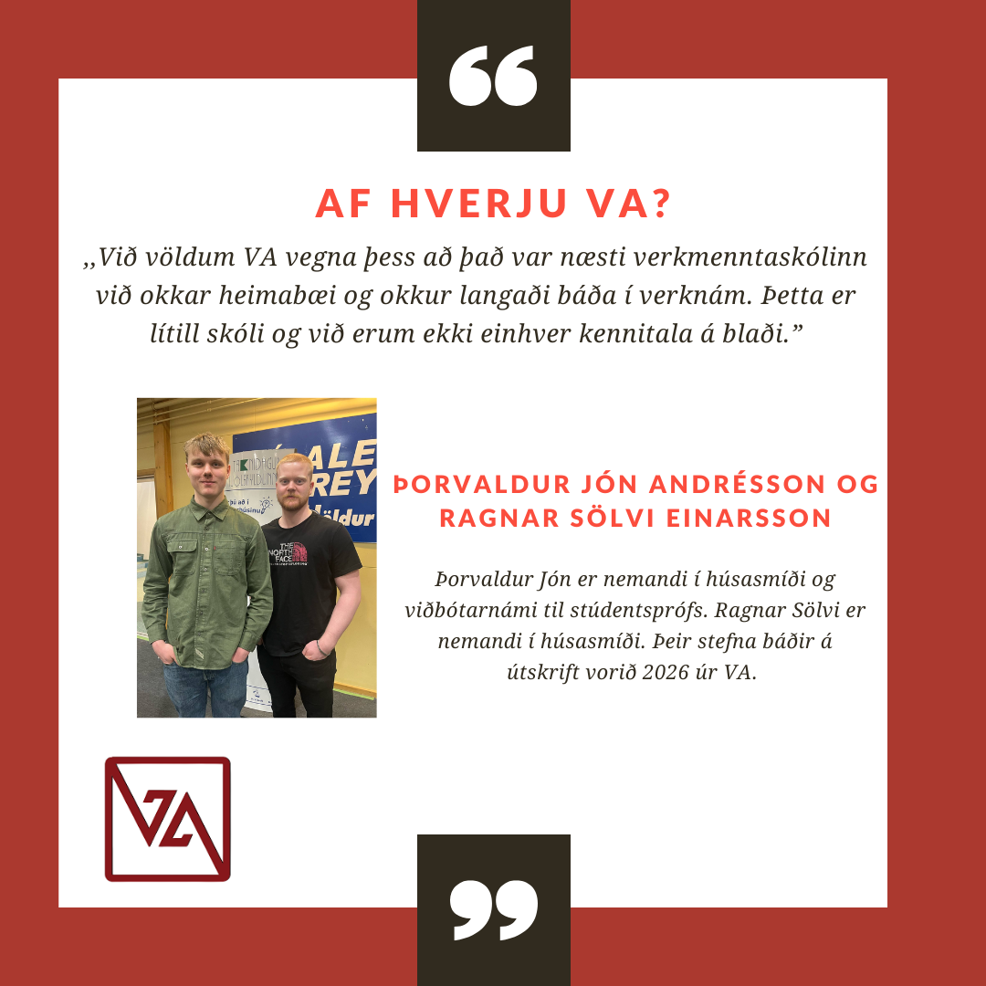 VA er lítill og persónulegur skóli með fjölbreytt námsframboð. Það er haldið mjög vel utan um alla nemendur og í skólanum er hægt að blanda saman bóklegu og verklegu námi.