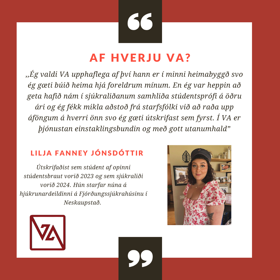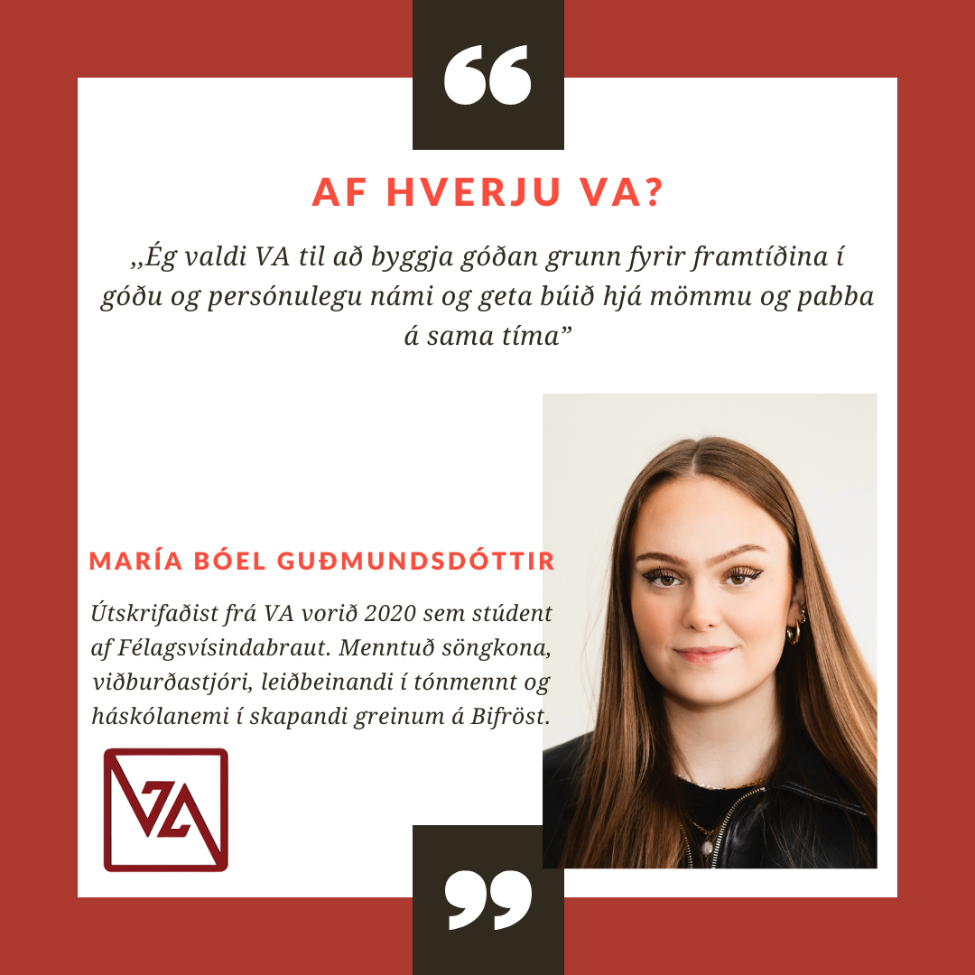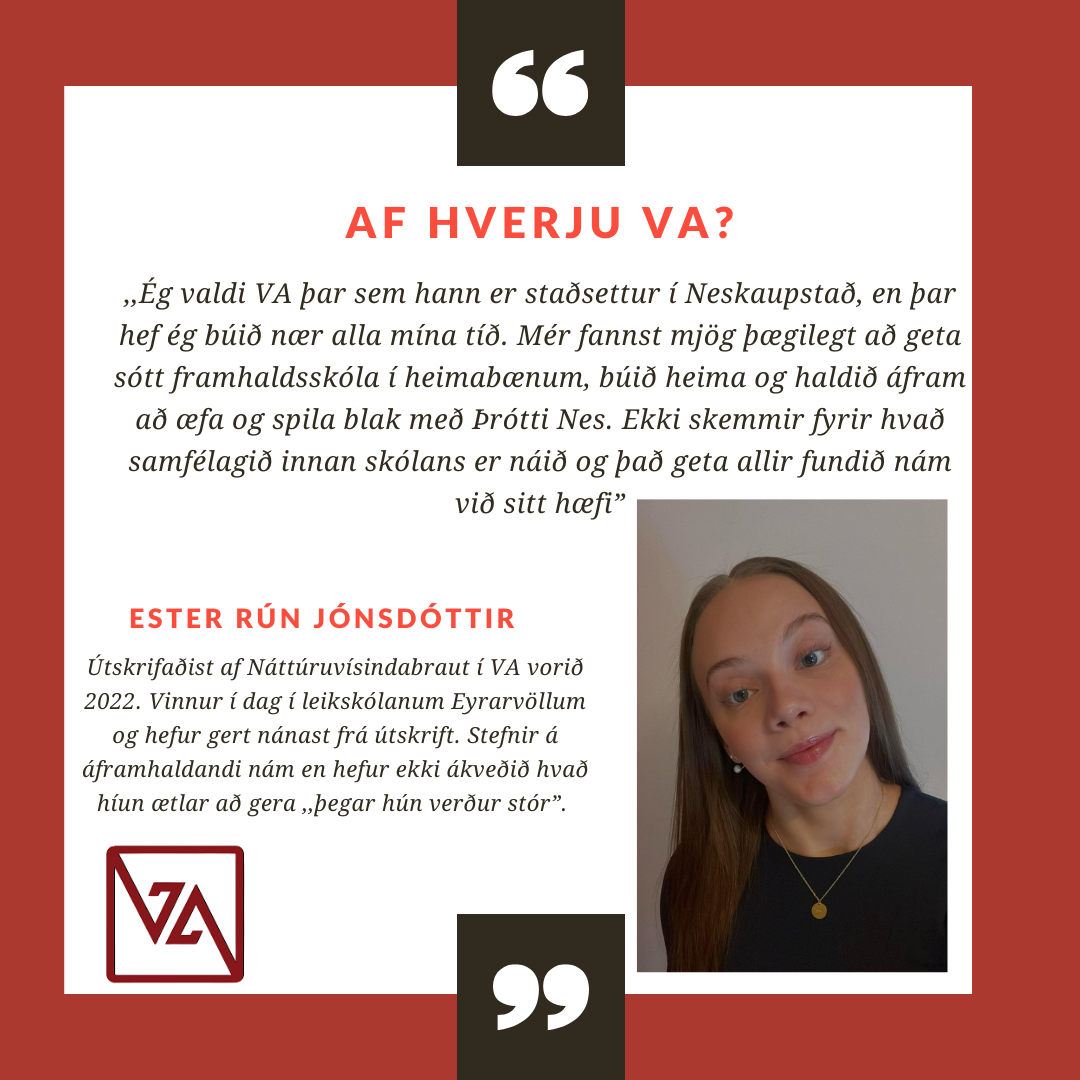 VA er lítill og persónulegur skóli með fjölbreytt námsframboð. Það er haldið mjög vel utan um alla nemendur og í skólanum er hægt að blanda saman bóklegu og verklegu námi.