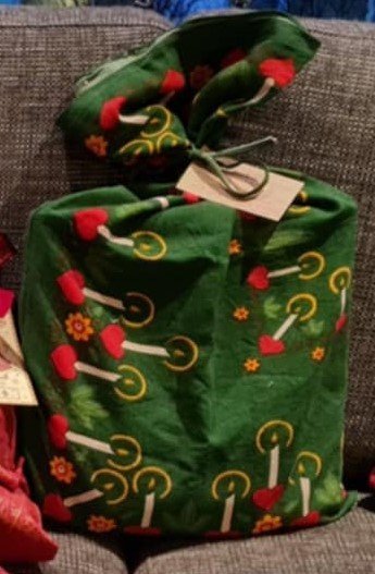 Hægt er að nýta gamla jóladúka, jólagardínur eða jólaefni (t.d. frá nytjamörkuðum) og útbúa gjafapoka fyrir jólagjafir. Þetta er umhverfisvæn leið til pakkninga og frábær staðgengill gjafapappírs. Hægt er að gefa efnið til baka til þess sem gaf það eða notað það sjálf til að pakka inn gjöfum. Gjafapokarnir eru falleg lausn sem hægt er að nota aftur og aftur.